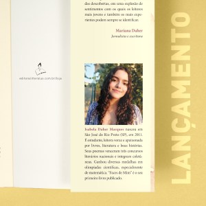 De acordo com o pai da autora, o jornalista e escritor Raul Marques, a jovem transforma, nessa obra, as dúvidas e as descobertas típicas da adolescência em poemas repletos de sutileza, luz, humanidade e inspiração. “Isabela produz uma poesia que nasce das suas indagações pessoais, mas que, ao mesmo tempo, reflete as dores, as alegrias e as vivências dos jovens de sua geração”, declara.